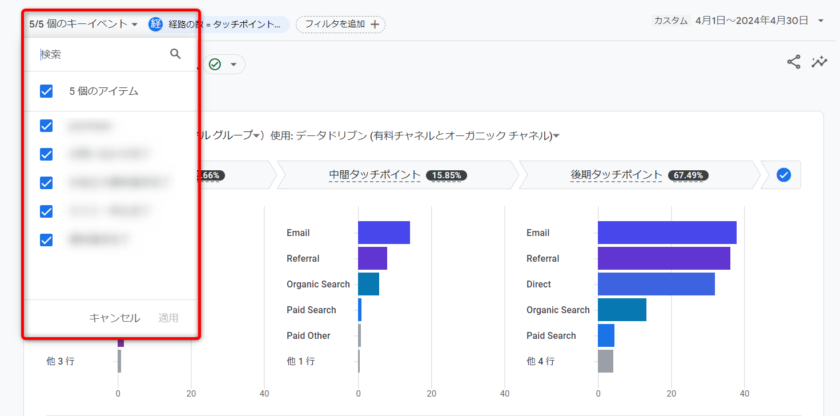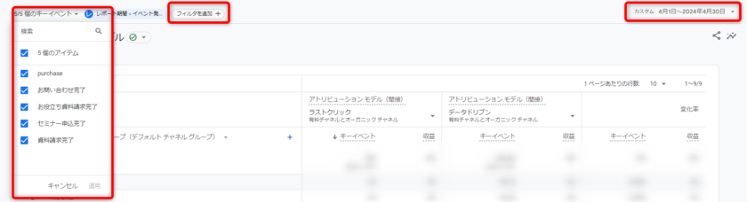 左上のプルダウンから、分析したいコンバージョンイベントを選択します。