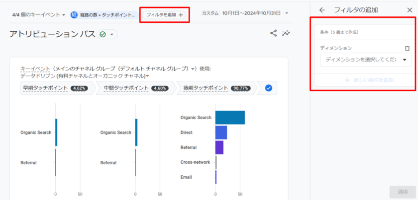 特定のユーザーに対する分析をしたい場合は「フィルタを追加」から、任意のフィルタを設定します。