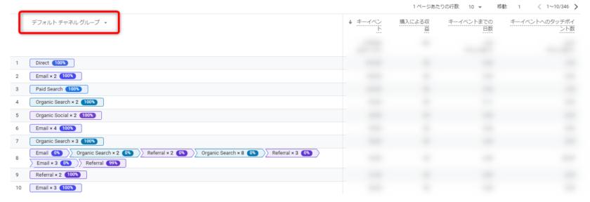 また、パーセンテージが示しているのは、各チャネルが「キーイベントへのタッチポイント数」に占める割合です。チャネルの組み合わせでコンバージョン数が多いかを確認することで、具体的なコンバージョンへの貢献度を分析できます。