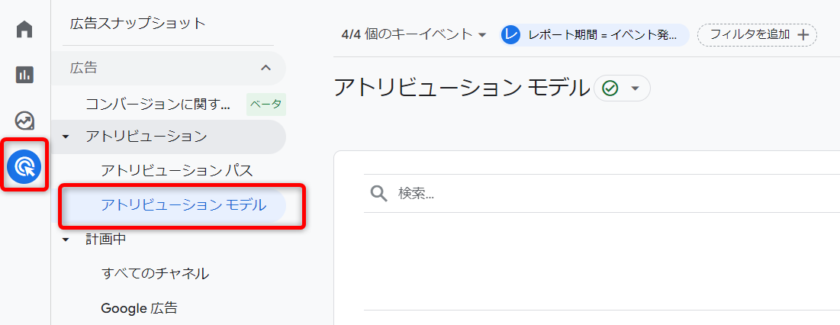 左側のメニューから「広告」を選択後、「アトリビューションモデル」をクリックします。