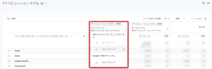 「アトリビューションモデル(間接)」の列をプルダウンし、比較したいアトリビューションモデルを選択します。
