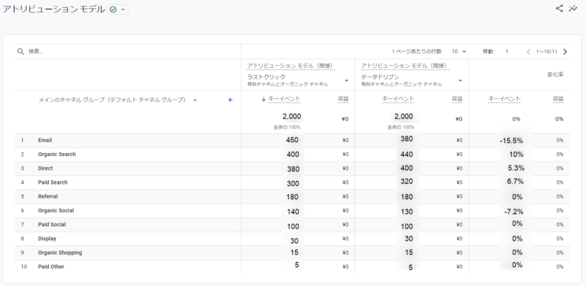 | メインチャネル | 「ラストクリック」 コンバージョン数 | 「データドリブン」 コンバージョン数 | 変化率 |