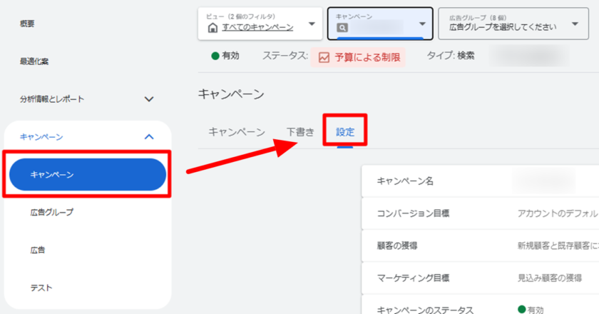 ①自動作成アセットはキャンペーン単位で設定します。まずは適用したいキャンペーンを選択し、キャンペーンの「設定」タブをクリックします。