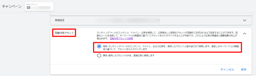 自動生成アセットは動的サイトリンクや動的スニペットコールアウトなど、広告の下に表示されることがあるアセットを自動で作成する機能で、アカウント単位で設定するものになりますので、間違えないように注意しましょう。