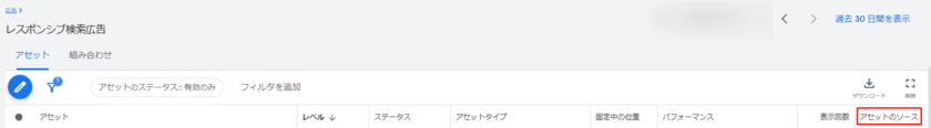 自動作成アセットの実績は、以下の手順にてレスポンシブ検索広告の「アセット」の部分から確認できます。
