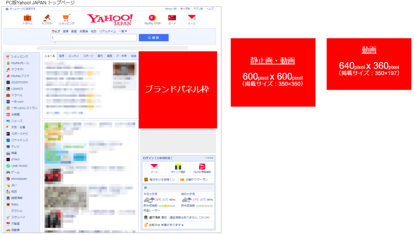 ブランドパネルとは、検索、知恵袋やショッピングなど様々なサービスのある日本最大級のポータルサイトYahoo! JAPANのトップページ上部の広告枠です。
