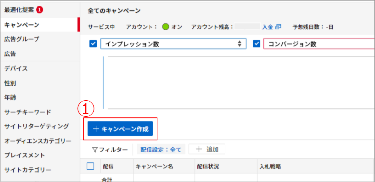 ① Yahoo!広告管理画面ツールより「キャンペーン作成」をクリック