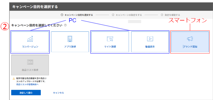 ②キャンペーン目的を選択する画面では、PC・スマートフォンそれぞれ選択できる項目が異なるので目的に沿ったキャンペーン目的を選択し「決定して進む」クリック