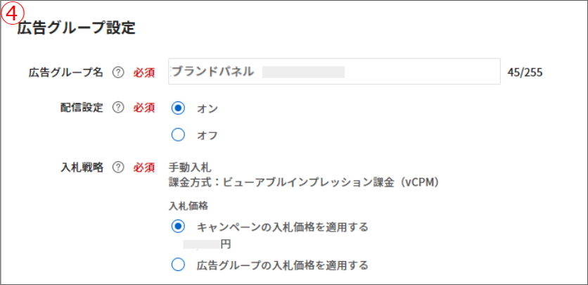 ④広告グループ設定もキャンペーン設定と同様に各項目を入力、選択をします。