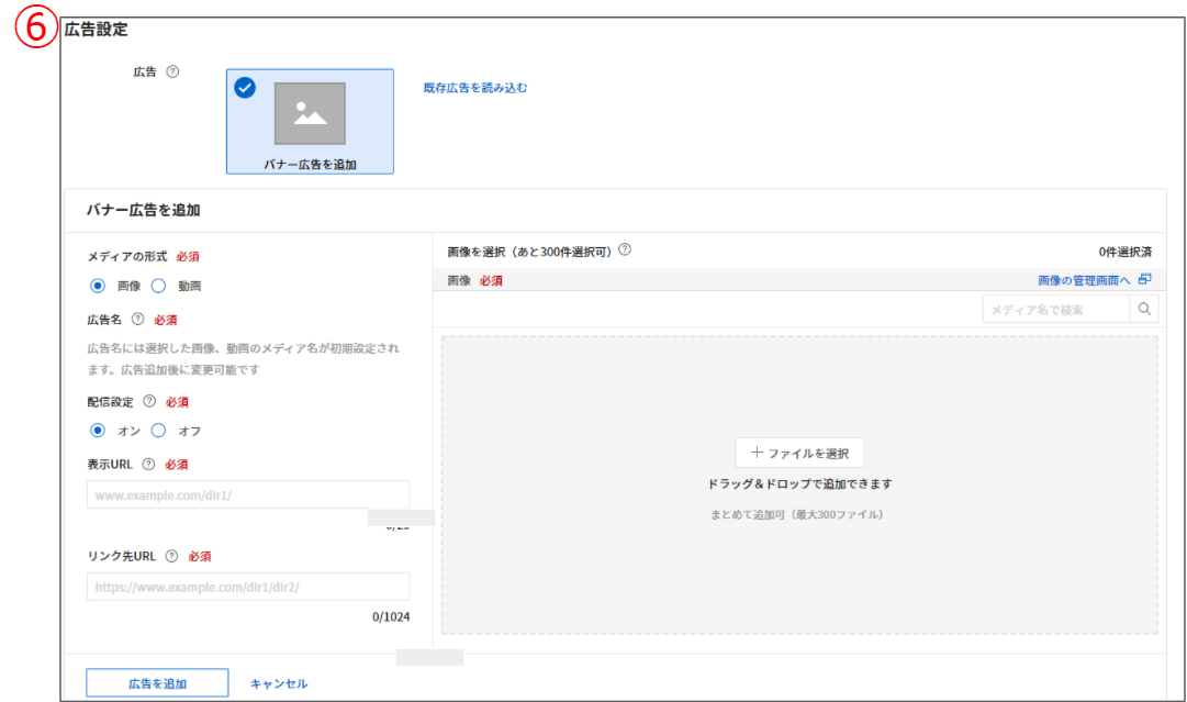 ⑥広告設定では実際に配信するバナー広告や動画広告を設定します。