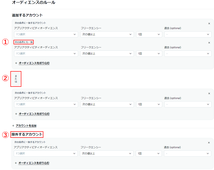事前に設定したオーディエンスをターゲティングしたい場合は、追加するアカウント、事前に設定したオーディエンスを除外したい場合は、除外するアカウントを選びます。