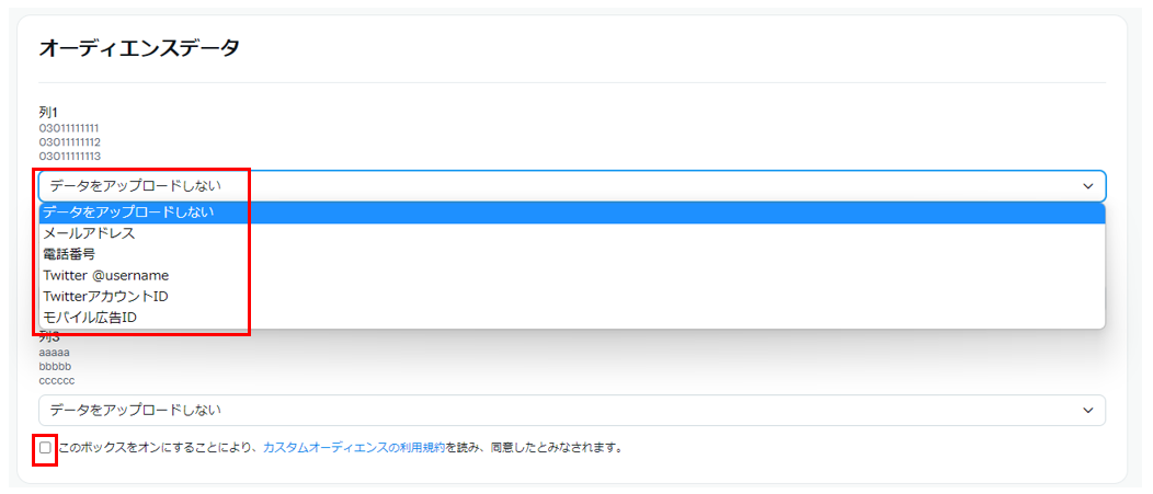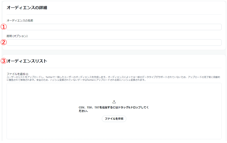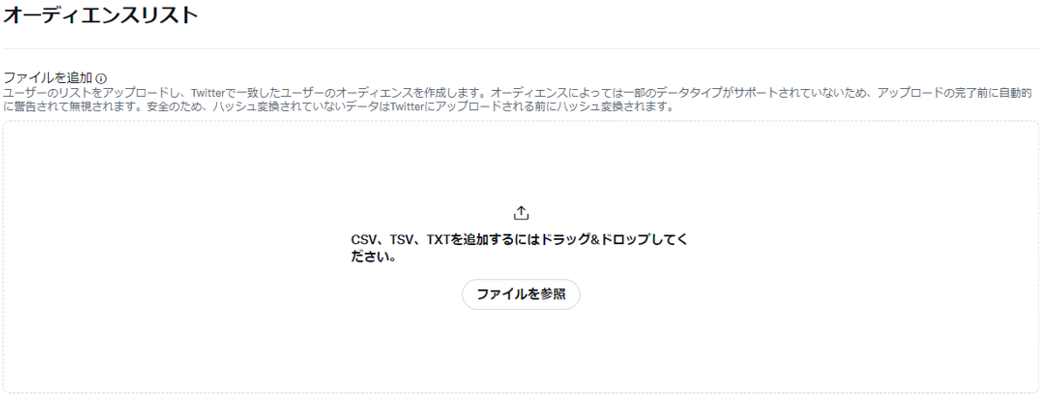 ※2023年1月23日以降、Twitter IDを利用したカスタムオーディエンスリストのアップロードには広告アカウント単位での事前申請が必要となりました。