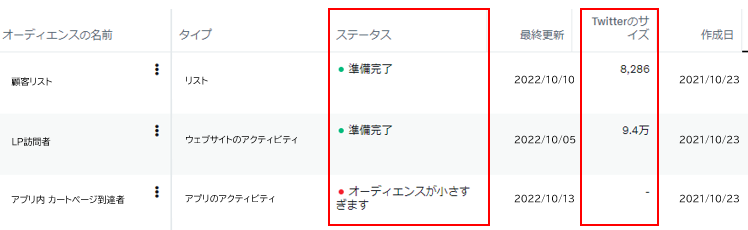 アップロードしたリストのサイズが100件であっても、全てのTwitterアカウントがアクティブであるとは限らないため、Twitterのサイズが100件未満になりオーディエンスが小さいと表示される場合があります。