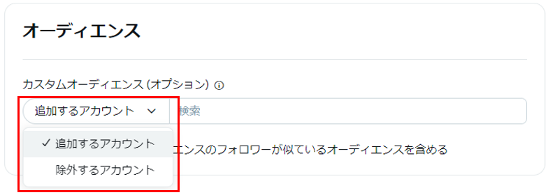 また、「選択したカスタムオーディエンスとフォロワーが似ているオーディエンスを含める」にチェックをすると類似するアカウントをターゲティングすることも可能です。