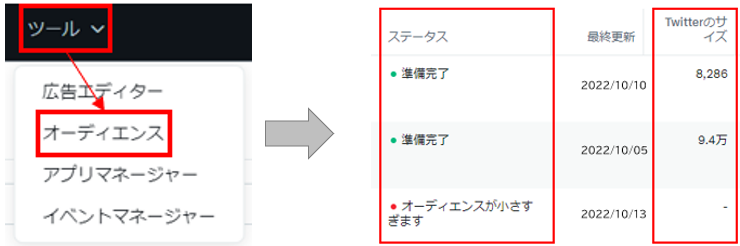 作成したカスタムオーディエンスのサイズは管理画面上にある「ツール」の「オーディエンス」で確認することができます。オーディエンスのサイズが小さすぎる場合は、収集元のデータ範囲を広げて対応しましょう。