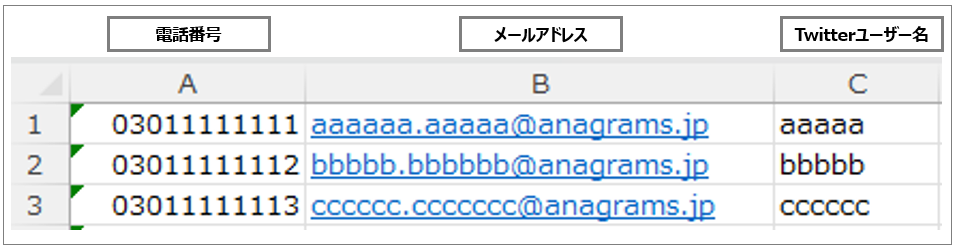 (イメージ A列:電話番号、B列:メールアドレス、C列:Twitterユーザー名)