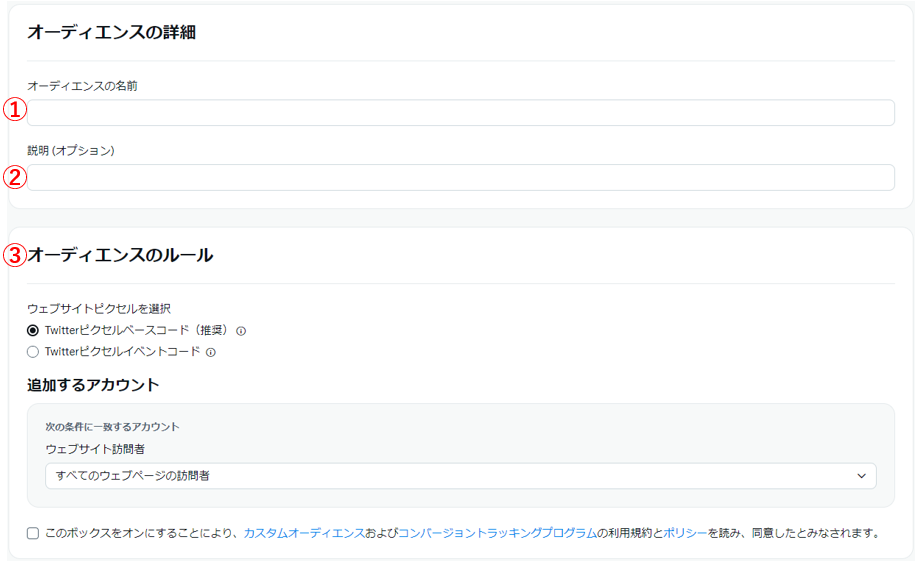 ※Twitterピクセルベースコードを選択した場合は、「すべてのウェブページの訪問者」「特定のウェブページの訪問者」のいずれかを選択します。