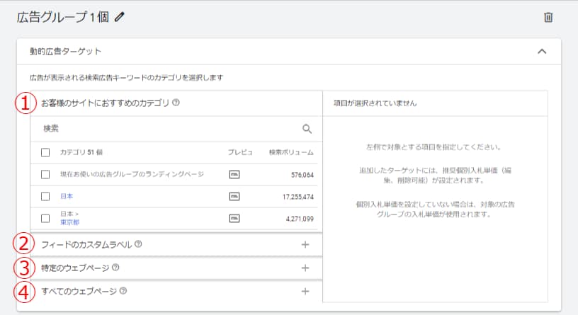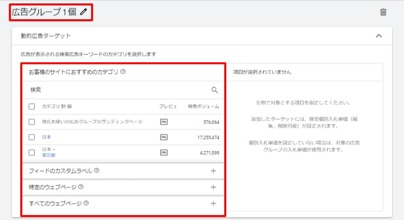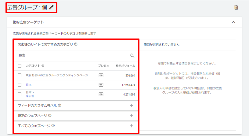 検索キャンペーンで使用しているすべてのランディングページや、サイトの構造に応じて自動でおすすめされる「カテゴリ」より対象を設定します。