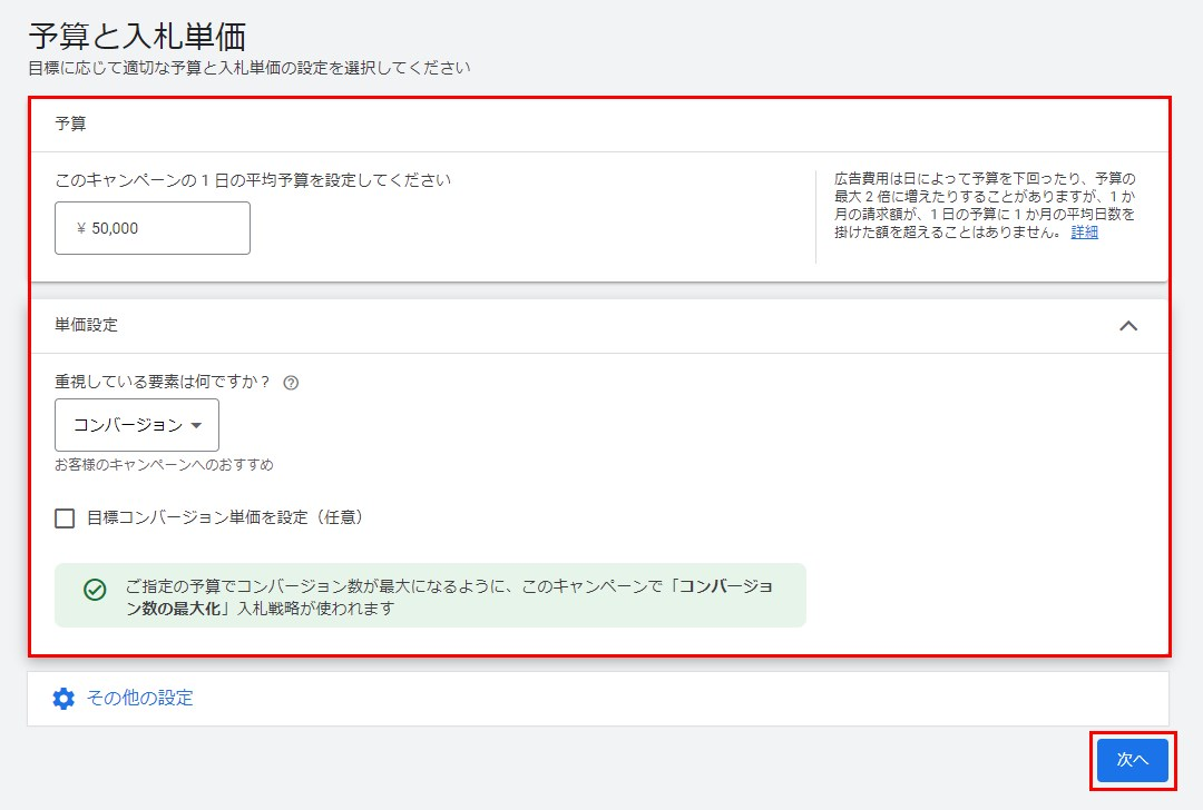 6.予算と単価設定を設定し、「次へ」をクリックします。