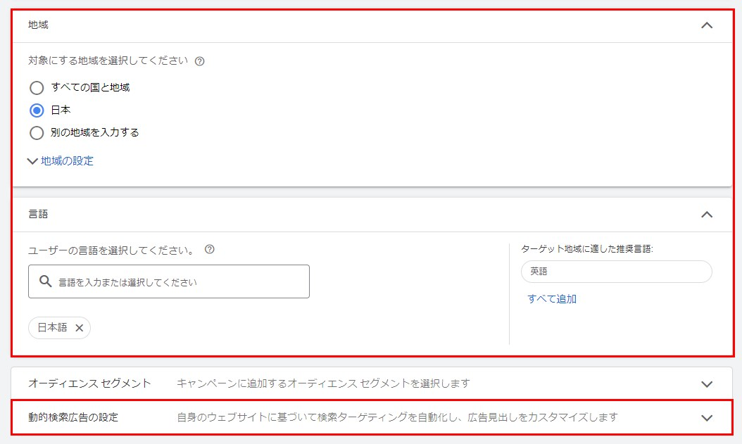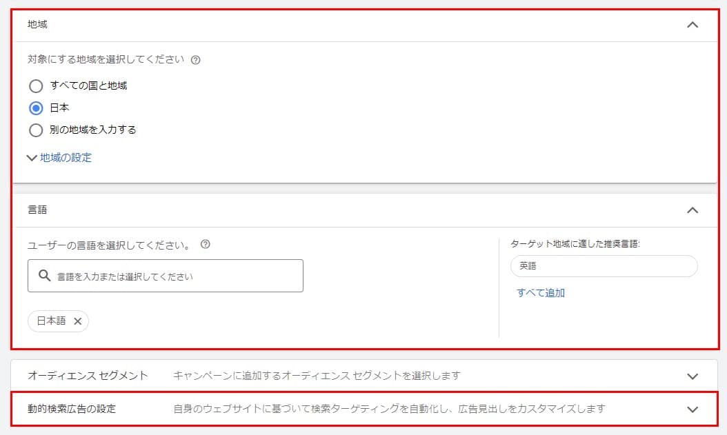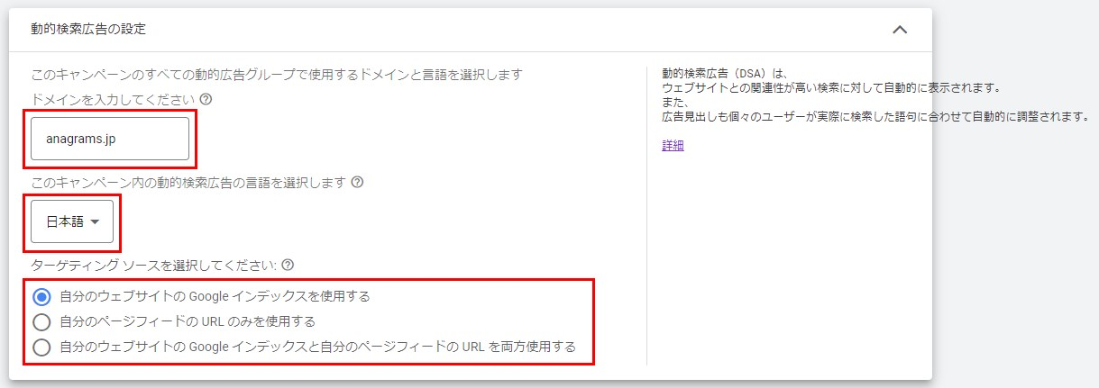 キャンペーン設定では、動的検索広告で使用するドメインや言語、ターゲティングソース(※)を設定します。