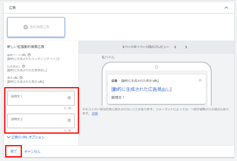 動的検索広告では、最終ページURL・広告見出し・表示URLは自動生成されるため、「説明文1」と「説明文2」のみを設定します。