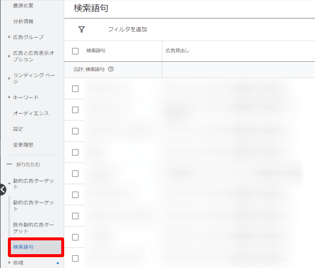 キャンペーンまたは広告グループを選択して「動的広告ターゲット」の「検索語句」を選択します。