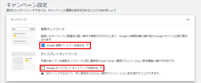 また、Googleの検索結果のみに配信を行いたい場合は「Google 検索パートナーを含める」のチェックも外しておきましょう。