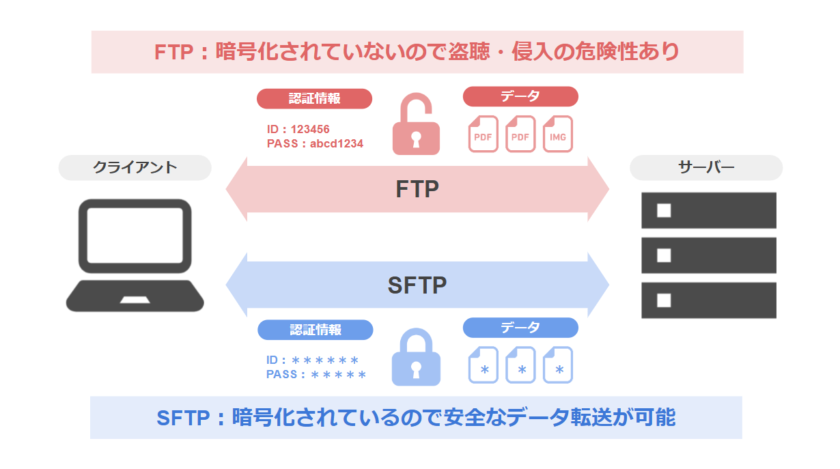 よくFTPと並列して提示されるSFTP(SSH File Transfer Protocol)は、FTPと同等の機能を持ちつつも、より安全なデータ転送ができるプロトコルです。
