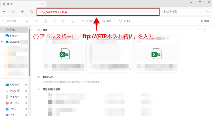 ①エクスプローラーを開き、アドレスバーに「ftp://(FTPホスト名)/」を入力