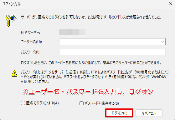 なお、FTPサーバーを利用する際には、FTPサーバー名・ユーザー名・パスワードが必要になるため、事前に確認しておきましょう。