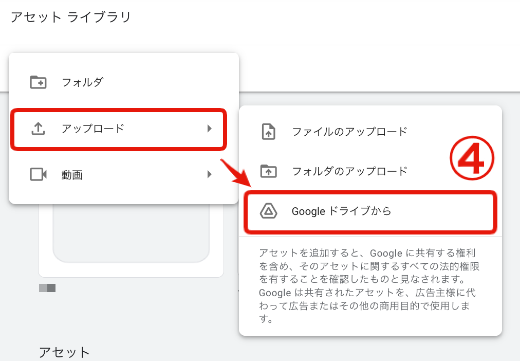 作成したバナーなどを 、Googleドライブで管理している方も多いのではないでしょうか?そんな時は、Googleドライブから直接アセットライブラリにアップロードできます。