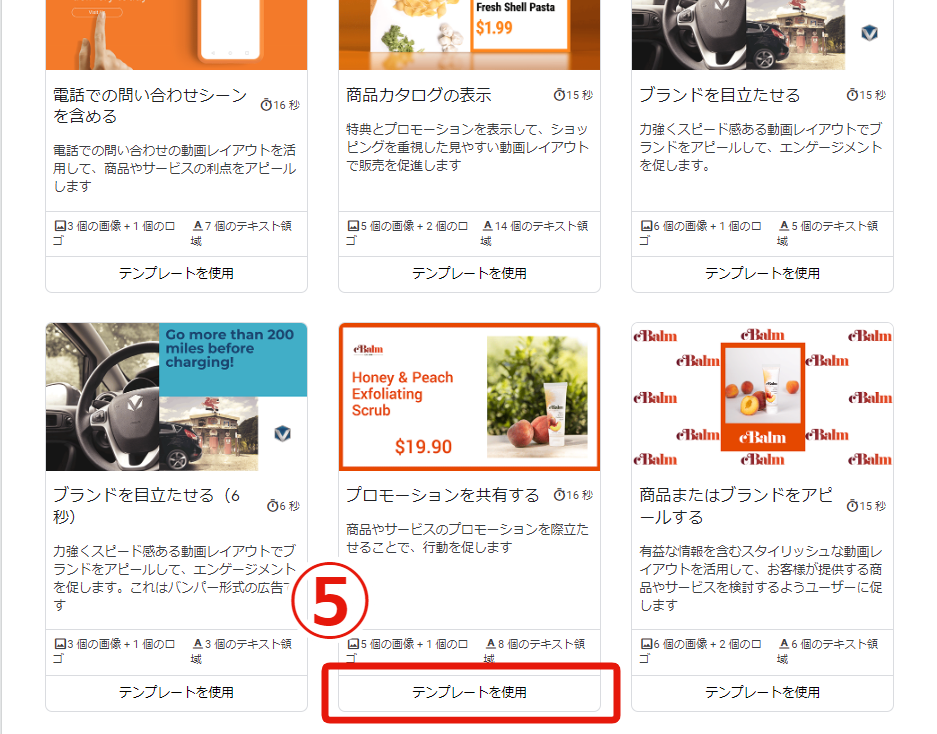 ⑤動画のテンプレートを選択します。テンプレートをクリックすると、プレビューできます。