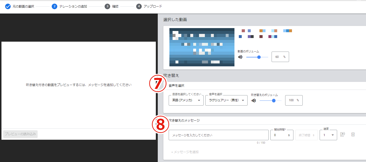 ⑧ナレーションを入力。開始時間・読み上げ速度を選択。