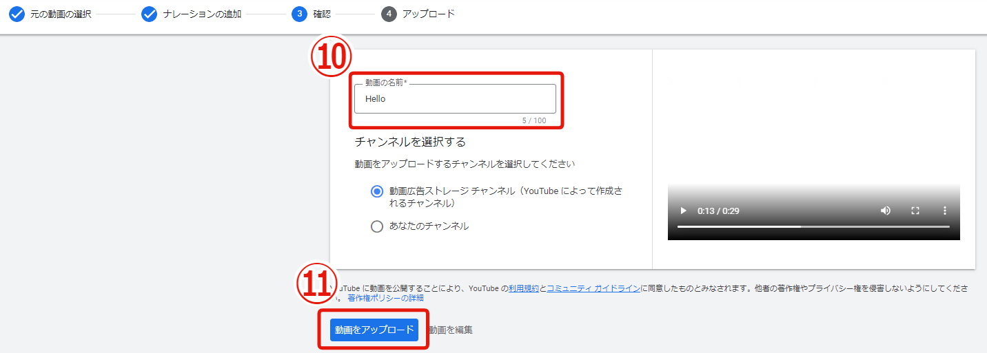 ⑪[動画をアップロード]をクリックして、動画をYouTubeチャンネルにアップロードして終了です。