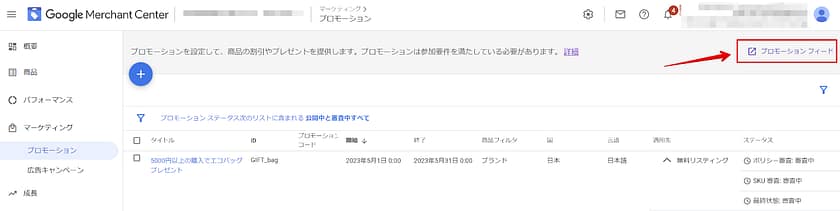 同じくGoogle Merchant Center 内、左メニューの「マーケティング」から「プロモーション」画面内、右上に「プロモーションフィード」をクリックすると、プロモーションフィードの設定に進むことができます。