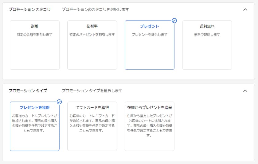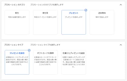 プロモーションカテゴリを選択すると、詳細項目の設定に進みます。ここでは「プレゼント」→「プレゼントを獲得」を選択しました。