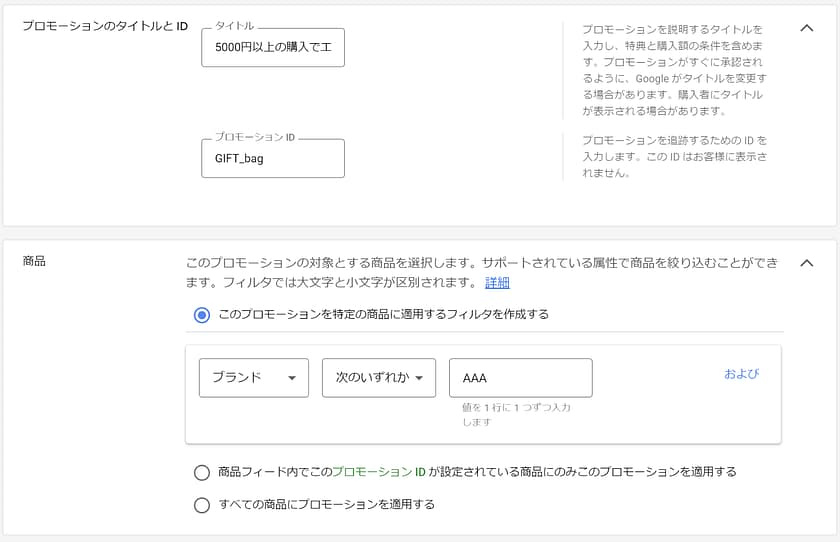 商品フィード内の、「アイテムID[id]」「商品タイプ[product type]」「ブランド[brand]」「商品グループID[item group id]」のいずれかに特定の値が入っている/入っていない商品を対象とする場合は、こちらで設定します。 - 商品フィード内でこのプロモーション ID が設定されている商品にのみこのプロモーションを適用する