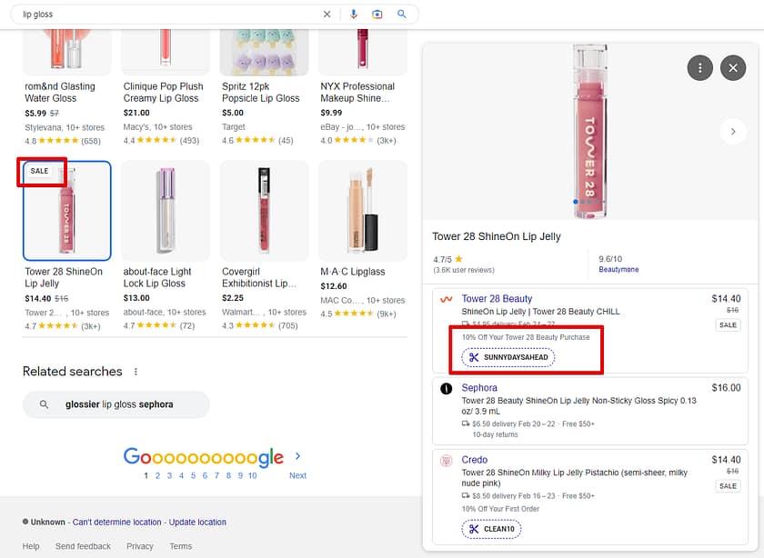 米国の事例となりますが、Merchant プロモーションを利用している商品がショッピング広告や無料リスティングで表示された際、下図のように「SPECIAL OFFER」や「SALE」が商品画像左上に記載されます。クリックし詳細を表示させると「一定金額以上の購入でギフトを進呈」だったり「クーポンコードを利用で10%オフ」といった形で、商品情報と共に特典情報をユーザーへ届けることができます。