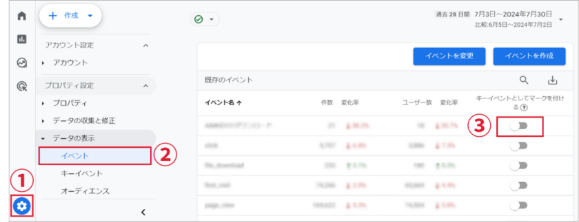 ③赤枠の列にキーイベントの発生数が表示されます。プルダウンを押すと特定のキーイベントのみの数値も確認できます。