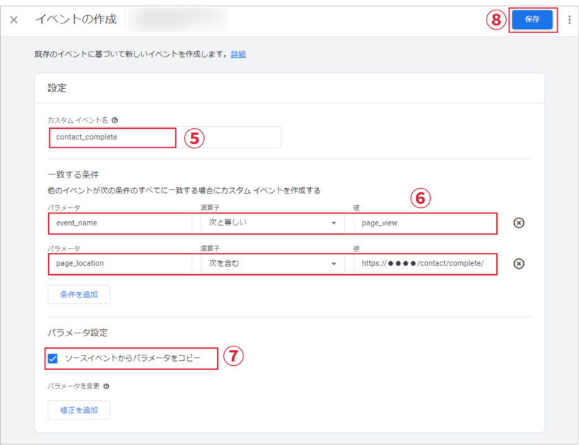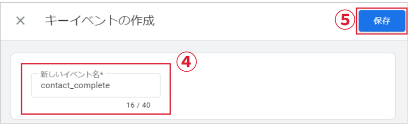 ⑤カスタム イベント名「contact_complete」を入力。