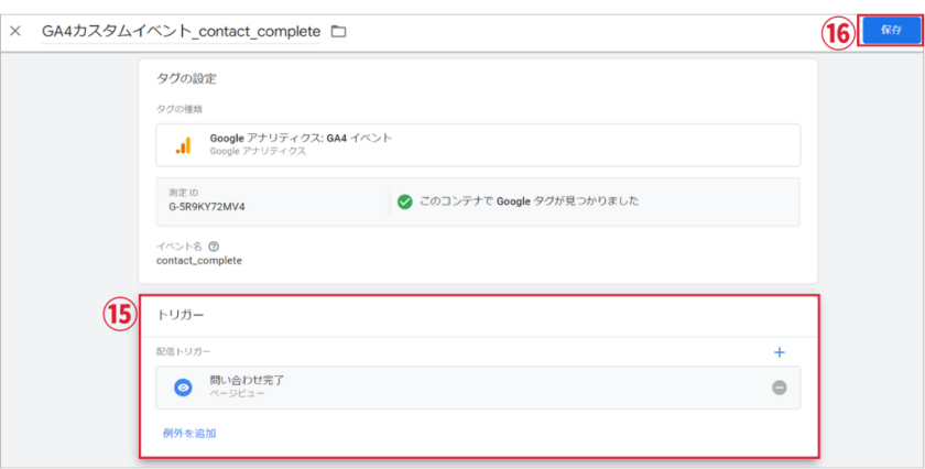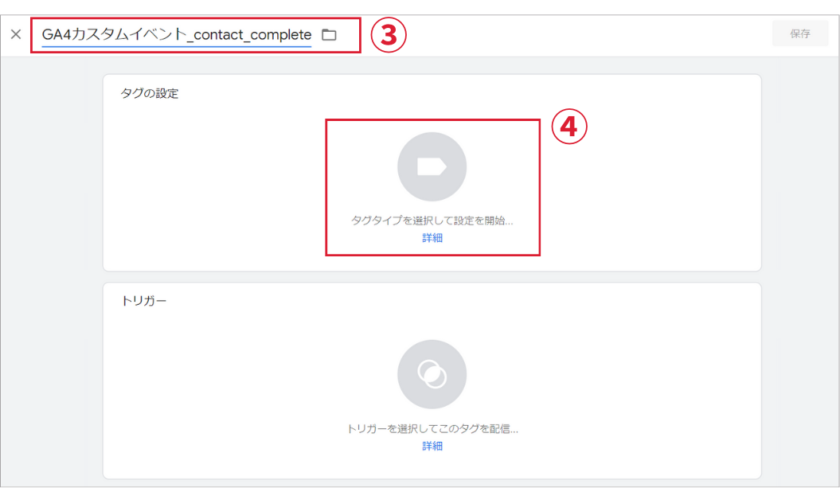③タグの中身がわかるように名前「GA4カスタムイベントcontact_complete」を設定。