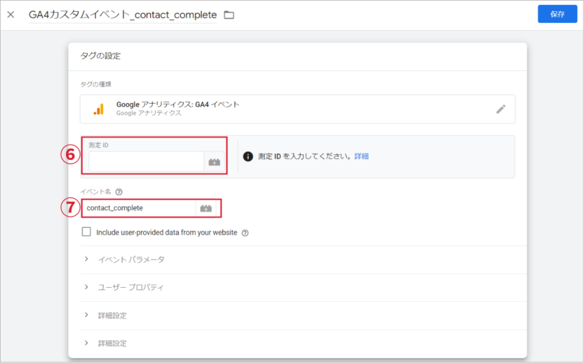 ⑦イベント名にはわかりやすい名前「contact_complete」を設定。
