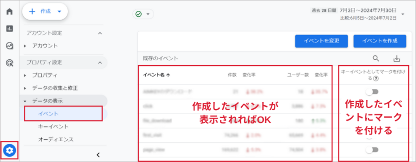 GA4管理画面またはGTMで設定したイベントが正常に計測されるとすると「GA4管理画面」>「管理」>「イベント」に表示され確認ができます。確認が出来たら「キーイベントとしてマークを付ける」をチェックしましょう。