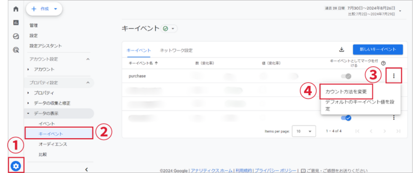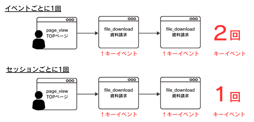 GA4では、キーイベントが発生した分だけカウントするのがデフォルト設定です。