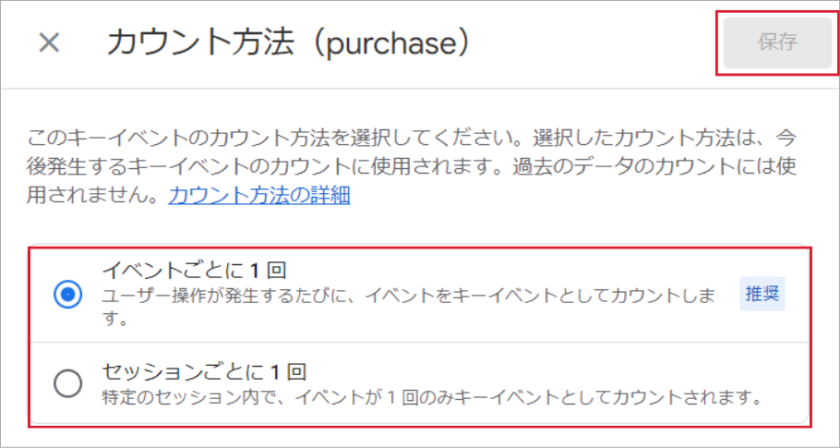 しかし、カウント方法はビジネスの目的に合わせて変更をおすすめします。たとえば、ECサイトのように一人のユーザーが複数回購入する可能性がある場合、「イベントごとに1回」計測が良いですが、資料請求など一人が複数回アクションをするものではない場合は「セッションごとに1回」が妥当でしょう。またカウント数の変更したとき、過去の数値のカウントは変更されません。注意して変更しましょう。
