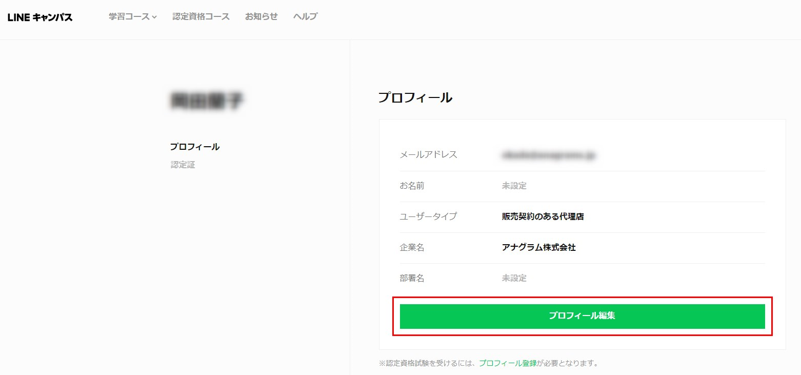 自社がLINEの法人向けサービスの販売代理店で、会社のメールアドレスでビジネスアカウントを作成した場合はユーザータイプが「販売契約のある代理店」となり会社名が自動で入力されます。「プロフィール編集」をクリックして次の項目をすべて入力します。