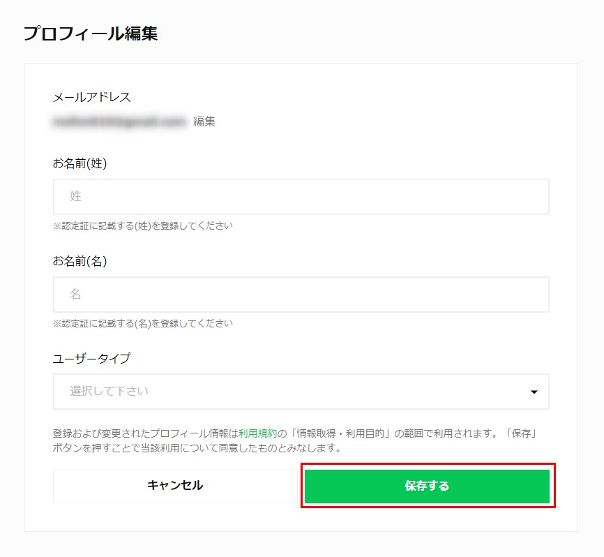 ・ユーザータイプ:「個人」または「法人」を選択します。「法人」を選択すると企業名の項目が表示されるのでそちらも入力しましょう。