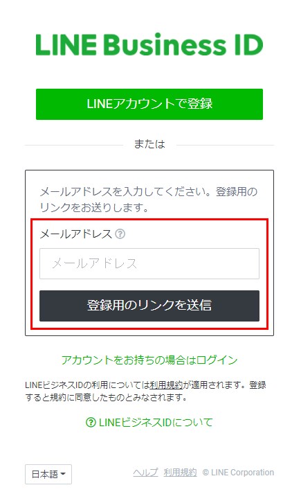 メールアドレスを入力して「登録用のリンクを送信」をクリックします。LINEの法人向けサービスの販売代理店の場合は、会社のメールアドレスで登録しましょう。