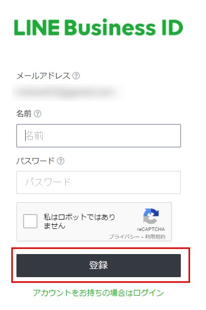 ビジネスアカウントの「名前」と「パスワード」を入力して「登録」をクリックで確認画面に移ります。再度、「登録」をクリックしてビジネスアカウントの作成完了です。「名前」は、後から変更が可能です。