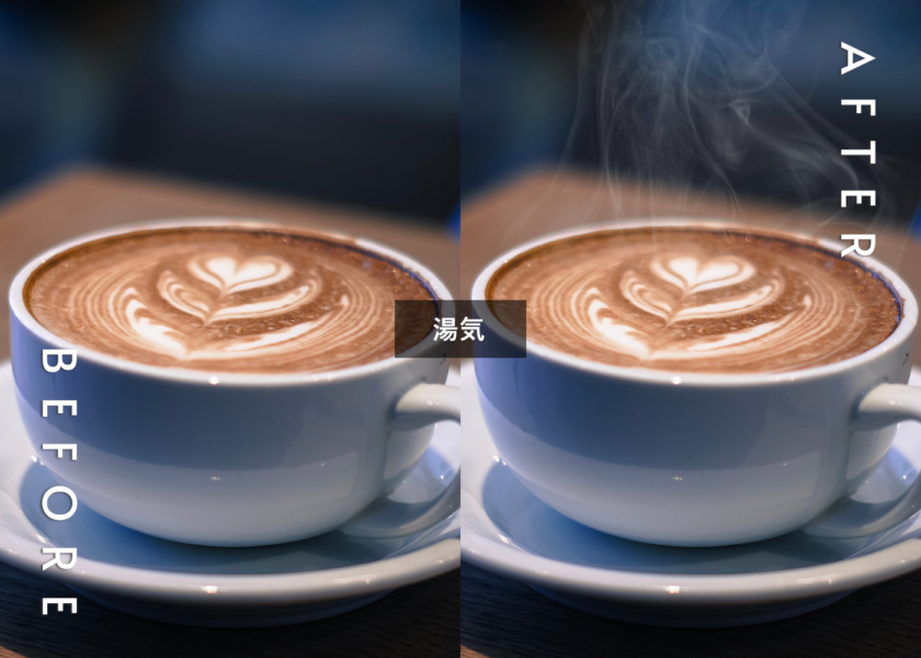 温かい食品に湯気を加えることで、できたてアツアツ感を演出できます。湯気があるのとないのとでは、温かさの感じ方にかなりの違いを感じませんか?